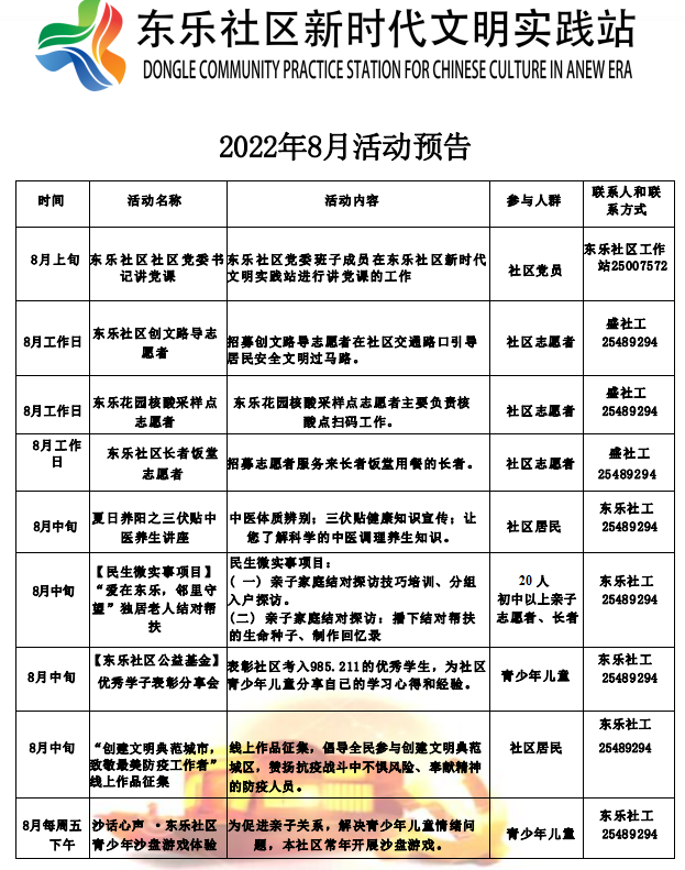 东乐社区新时代文明实践站2022年8月活动预告