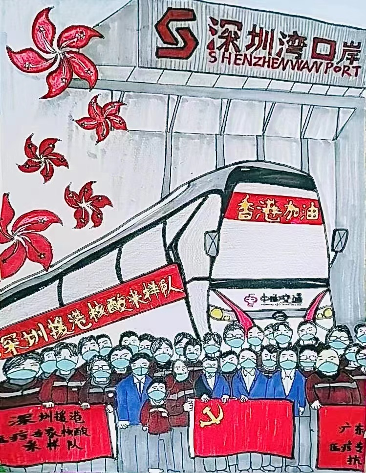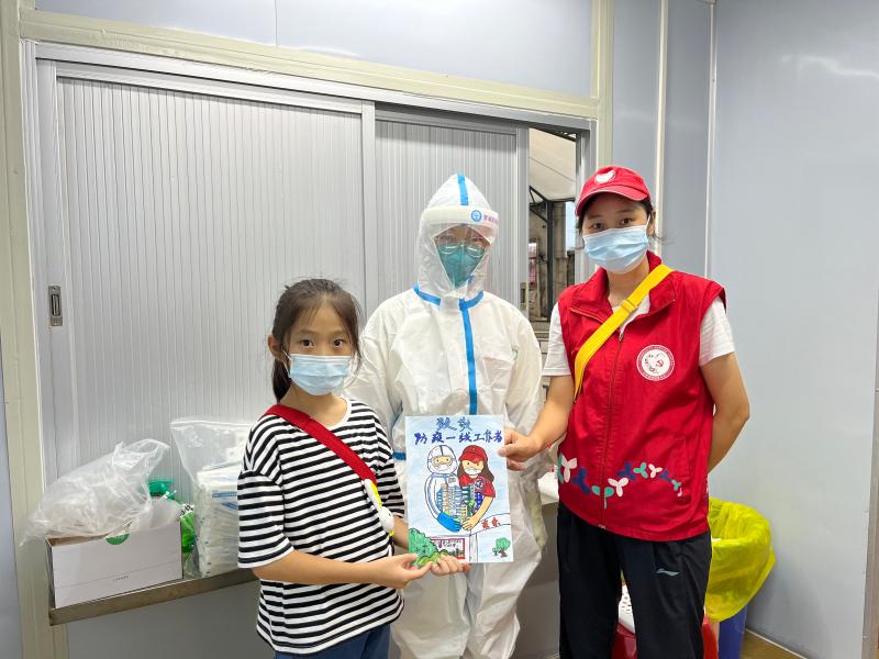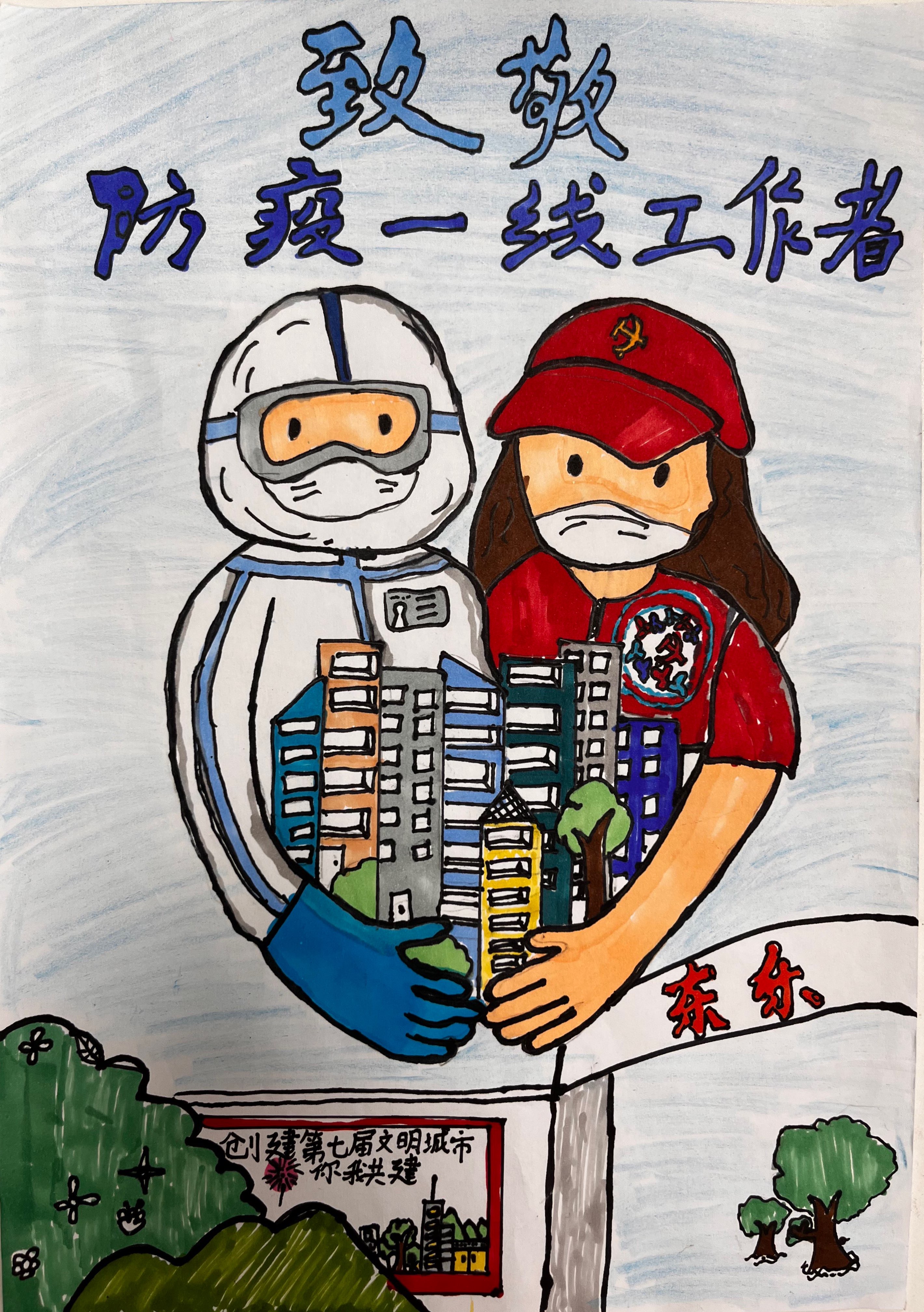 东乐辖区居民霍嘉琳称:“我是罗湖港人子学校的一名小学生,很荣幸能够参加本次活动,能让我用我的画笔通过这个平台点亮梦想,传递感恩!在这场疫情阻击战中,社区防疫人员始终站在疫情防控第一线,夜以继日,不辞劳苦,有他们在,我的心里就觉得特别地踏实和安心。我从心底敬佩所有抗战在疫情一线的防疫战士们!”