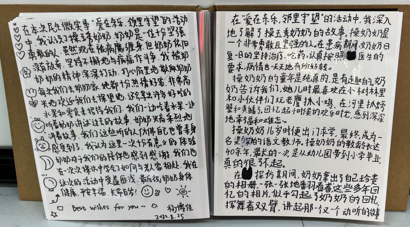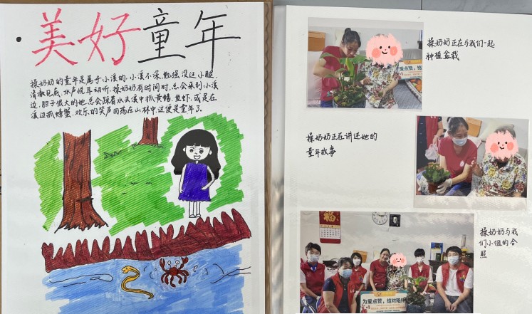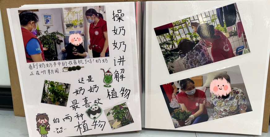 社工和志愿者们为操奶奶制作了专属的个人回忆录,一起分享奶奶年轻时的故事,以旧照片和设计插画,添加文字记录的方式重现奶奶的光辉岁月,将奶奶的经历和荣誉变得可视化,让奶奶从直观感受上提升自我价值感和人生荣誉感。