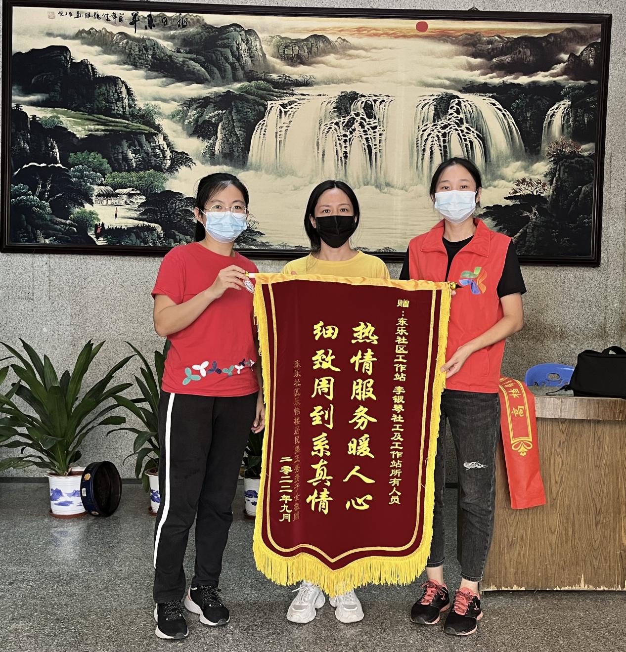 2022年9月13日,东湖街道东乐社区党群服务中心收到来自社区居民操女士赠送的一面锦旗,赞誉东乐社区李银琴社工及全体人员热情服务暖人心,细致周到系真情。