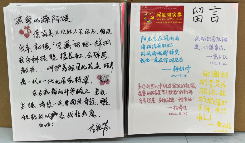 操奶奶的女儿特意向社区送来锦旗表示感谢,操女士称:“社区爱在东乐,邻里守望帮扶项目真的做到了心坎上,感谢社区对家里老人的关心,谢谢社区细致的服务和用心制作的回忆录册子给妈妈带来了莫大的鼓励。在艰难的治疗中,让奶妈妈对战胜病魔有了信心,重新接受治疗。”