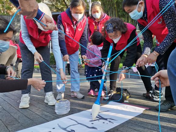 本次户外拓展活动,由东乐社区社工设计了两个游戏,分别是:“重走长征路”和“书写团结一心”。“重走长征路”玩法是义工拉紧长征地图,在长征地图上把滚动的球按路线从起点运送到终点,过程中球不得掉进设计好的洞里;“书写团结一心”玩法是用一支大毛笔,由数名义工各牵绳的一头,在纸上写出“团结一心”四个字。活动现场,志愿者们按单双数分成两小组进行游戏,两轮游戏过程中都非常考验团队的协作能力,我们的志愿者无惧考验,经过通力合作,都成功地完成了游戏。