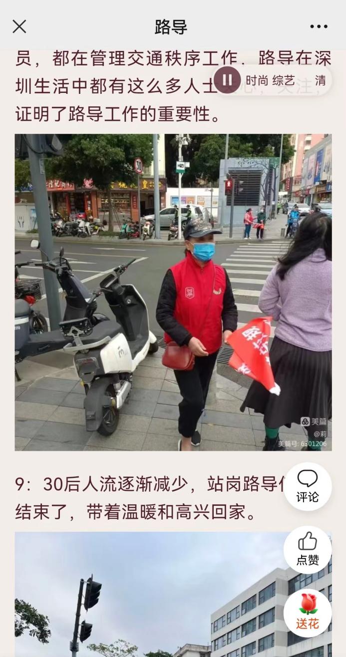 一位帅哥骑着电瓶车说:“我给你们拍照”,还有市容巡查员,在执行管理交通秩序工作。路导在深圳生活中都有这么多人关心,关注,证明了路导工作的重要性。