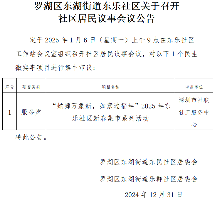 罗湖区东湖街道东乐社区关于召开社区居民议事会议公告