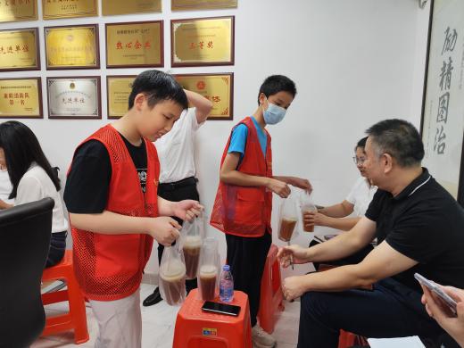 在活动现场,青少年志愿者们认真学习柠檬茶制作技巧,将一杯杯冰爽饮品精心打包,并亲手送到物业工作人员手中。“你们辛苦了!”简单的问候传递着真挚的感谢。物业工作人员纷纷表示,这份清凉慰问让他们倍感温暖。