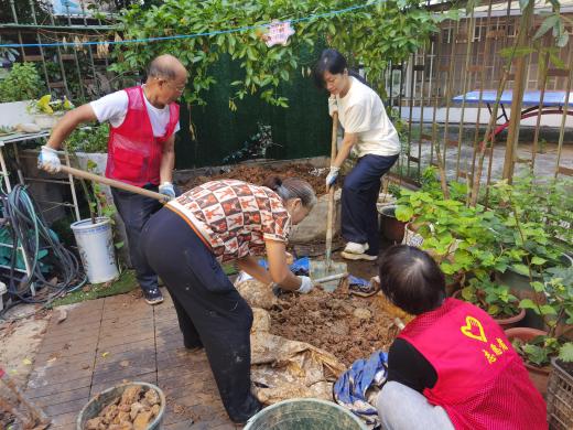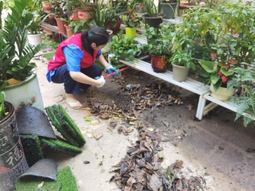 活动中,志愿者们热情投入,分工协作,将物业提供的泥土分装入种植箱,并通过添加树叶、腐殖土等方式改良土壤结构。大家还细致撒上石灰粉进行防虫处理,为植物更换新盆、补充土壤,并清理花盆积水,有效预防蚊虫滋生,防范基孔肯雅热等疾病传播。