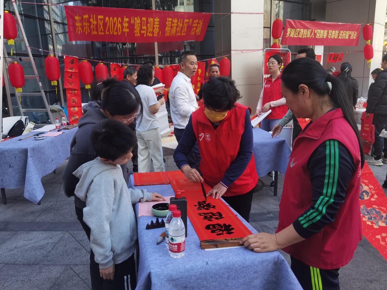 活动现场,墨香四溢,红纸翻飞。在罗湖区退役军人事务局的大力支持下,七位书法老师(其中多位为退役军人)挥毫泼墨,笔走龙蛇。一副副寓意吉祥、笔力遒劲的春联和“福”字在他们手中诞生,既有对国泰民安的美好祝愿,也有对家庭幸福的深情期许。居民们或静静围观点评,或精心挑选心仪的词句,脸上洋溢着喜悦的笑容。“老师现场写的春联,比印刷的更有味道、更有温度!这副‘平安二字值千金,和顺满门添百福’,我一眼就相中了,准备贴在大门上!”手持新鲜出炉春联的李阿姨高兴地说道。