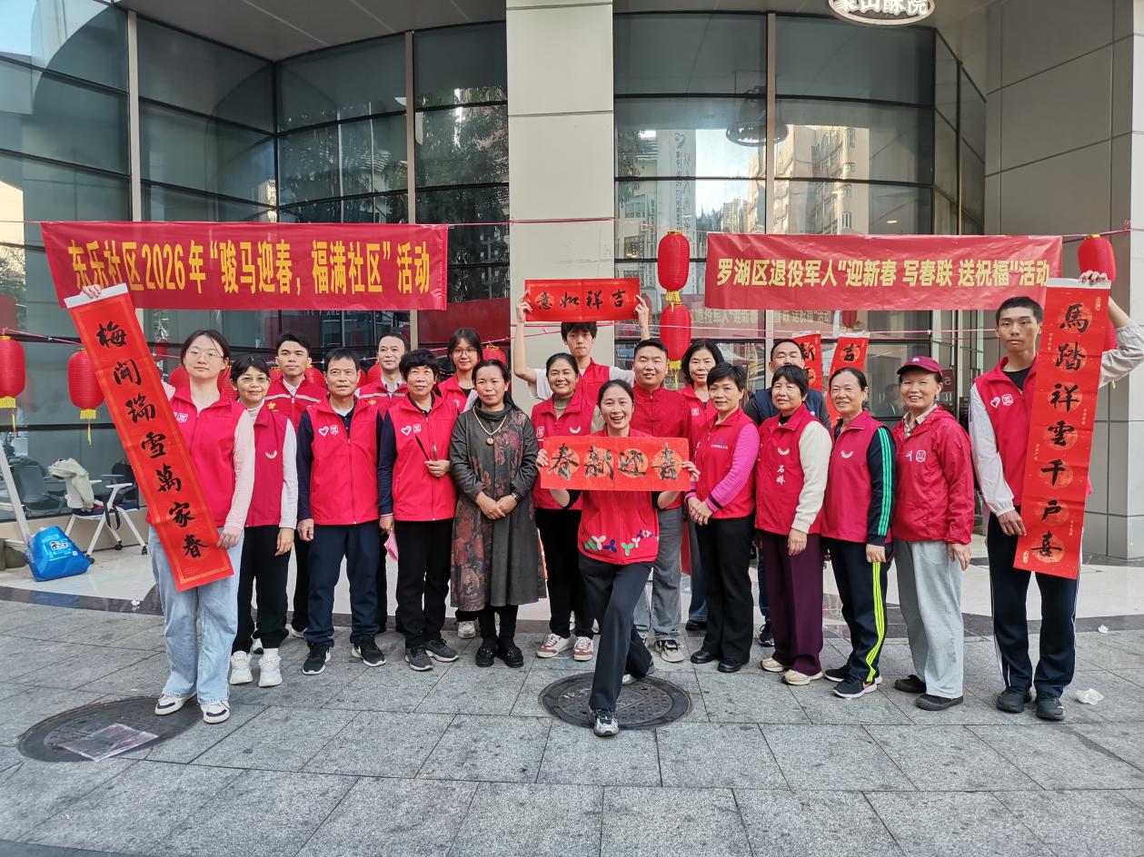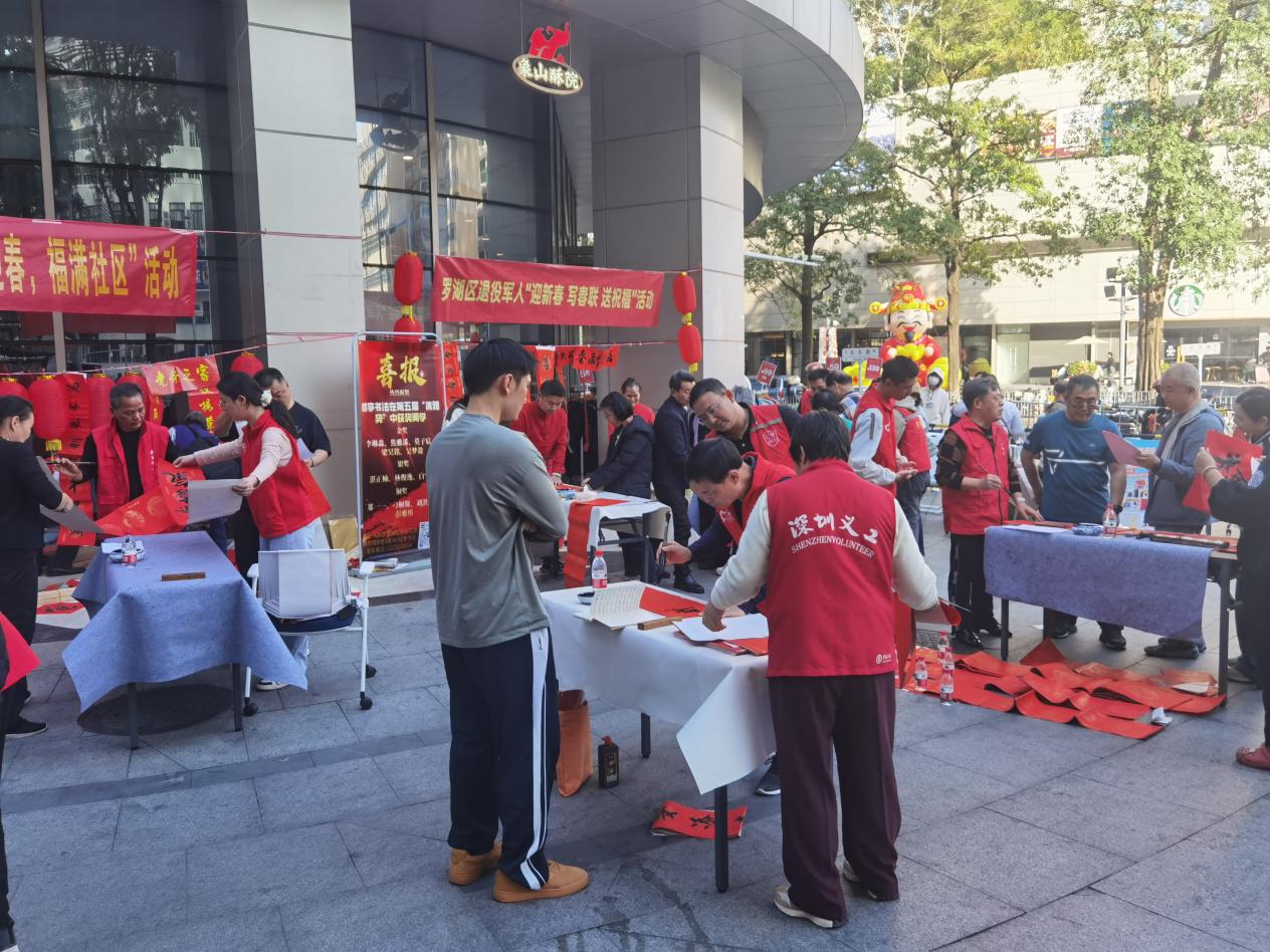 活动现场,墨香四溢,红纸翻飞。在罗湖区退役军人事务局的大力支持下,七位书法老师(其中多位为退役军人)挥毫泼墨,笔走龙蛇。一副副寓意吉祥、笔力遒劲的春联和“福”字在他们手中诞生,既有对国泰民安的美好祝愿,也有对家庭幸福的深情期许。居民们或静静围观点评,或精心挑选心仪的词句,脸上洋溢着喜悦的笑容。“老师现场写的春联,比印刷的更有味道、更有温度!这副‘平安二字值千金,和顺满门添百福’,我一眼就相中了,准备贴在大门上!”手持新鲜出炉春联的李阿姨高兴地说道。