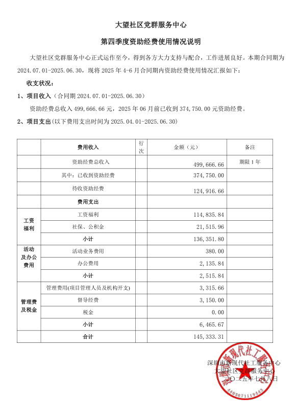 大望社区党群服务中心第四季度资助经费使用情况说明