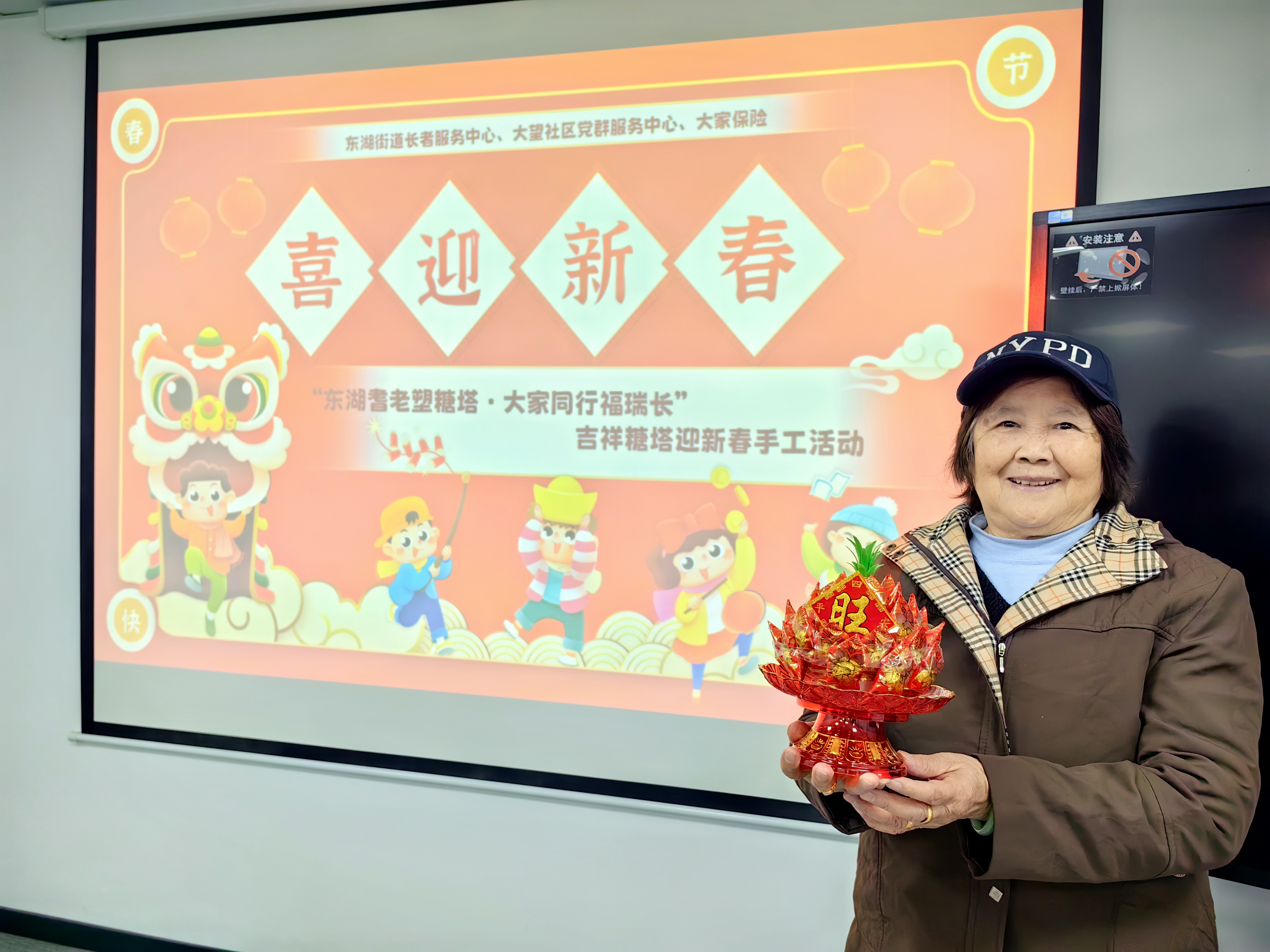 近日,由东湖街道长者服务中心、大家保险主办,大望社区党群服务中心承办的 “东湖耆老塑糖塔・大家同行福瑞长” 吉祥糖塔迎新春手工活动在大望社区举行。此次活动吸引了20名社区老人参与,现场洋溢着浓厚的节日氛围。