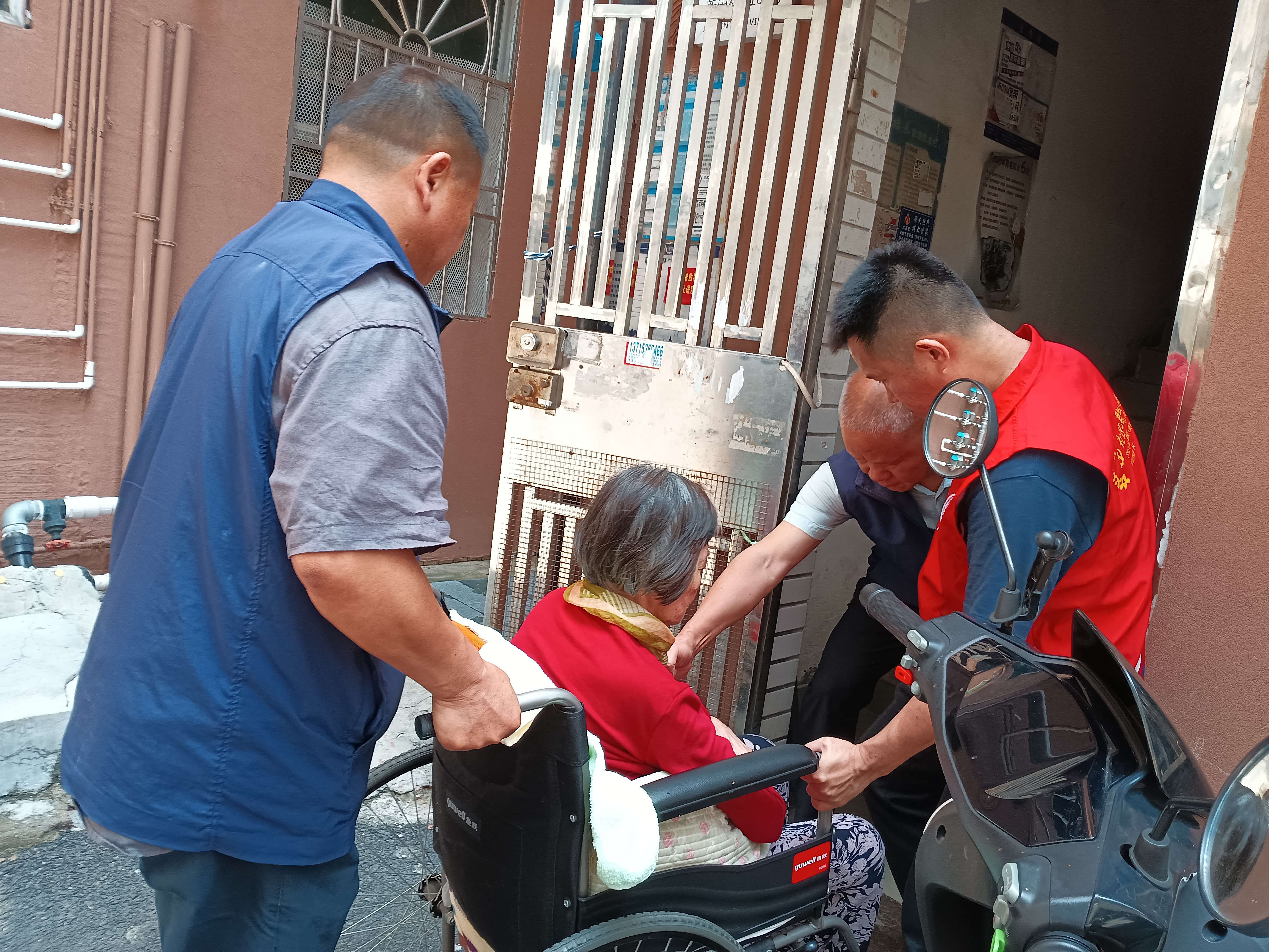 上午9时,3名志愿者、2名网格员与1名社工组成“护送小队”抵达陈姨家中。为确保安全,团队制定了“三阶段护送方案”:健康评估:志愿者为老人测量血压、心率,确认身体状况稳定;平稳转移:两名志愿者用专业设备将老人从床榻移至轮椅,网格员同步清理楼道杂物;阶梯攻坚:三人协作抬轮椅下楼,一人扶稳老人,两人把控轮椅平衡,在狭窄楼道中稳步前行,全程耗时28分钟。