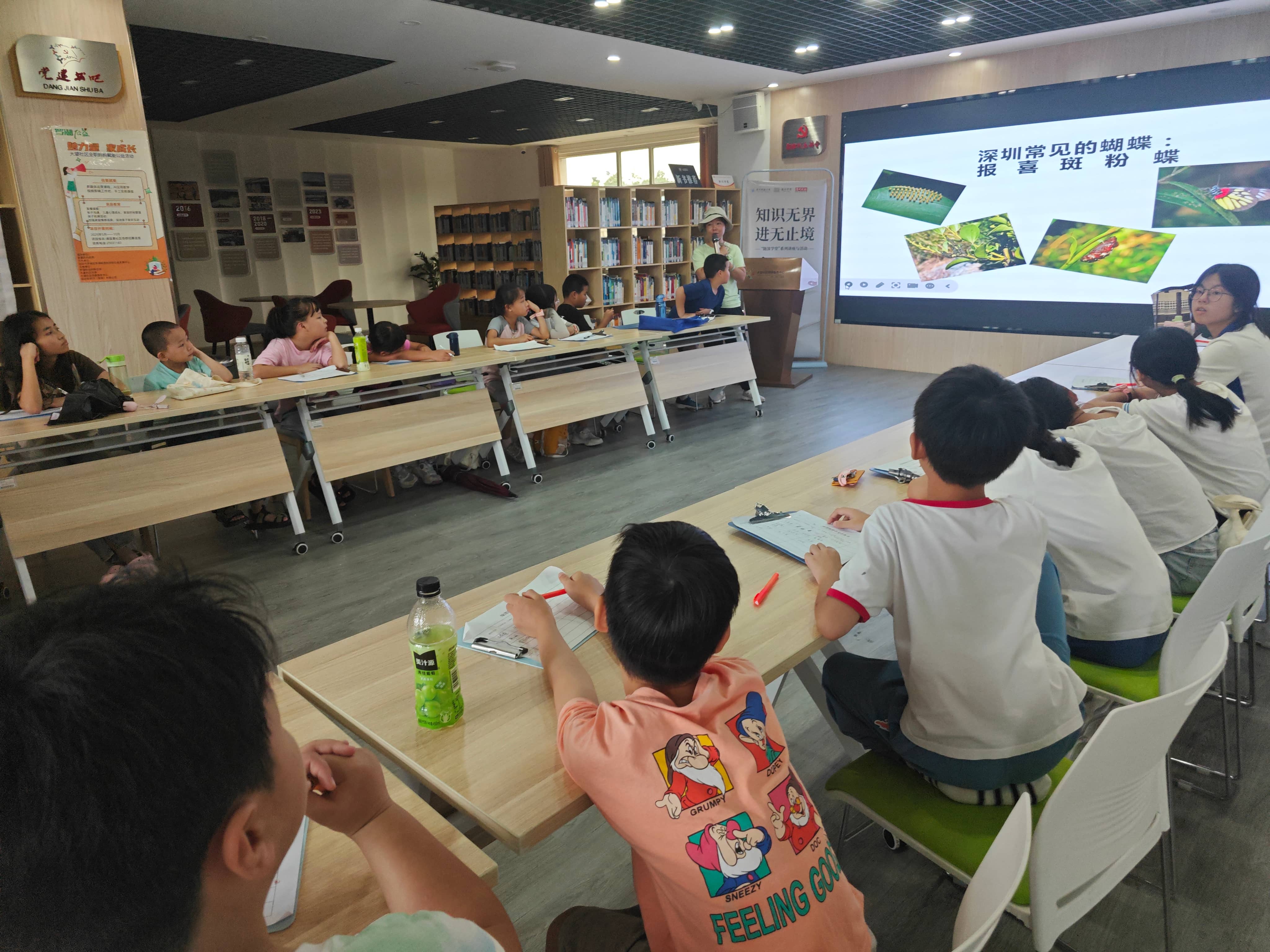 户外探索意犹未尽,孩子们转场至社区悠图书馆,开启了一场室内知识盛宴。通过精心制作的PPT,讲师为孩子们系统性地介绍了深圳本土丰富的生物多样性。从市花簕杜鹃到红树林的独特生态系统,从穿梭于城市间的各种鸟类到色彩斑斓的蝴蝶家族,一幅幅精美的图片和一段段精彩的视频,将深圳这座“千园之城”的生态画卷徐徐展开。孩子们不仅学到了科普知识,更增强了对所居住城市的生态认同感和保护意识。