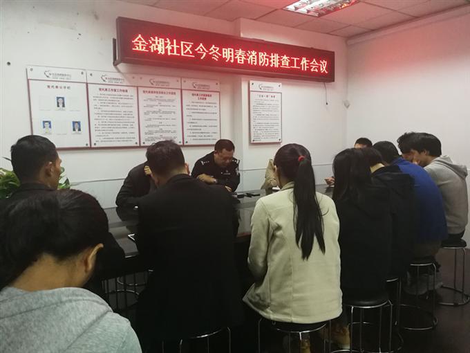 为做好今冬明春消防安全工作,坚决预防和遏制火灾事故发生,确保辖区居民群众生命财产安全,2017年12月26日下午,金湖社区召开今冬明春消防安全大排查大整治专项行动工作会议。社区工作站全体工作人员及辖区民警参加了会议。会议传达了上级关于开展消防安全大排查、大整治的会议精神,并就立即组织开展消防安全大排查大整治行动,推进安全生产各项责任落实进行了部署。