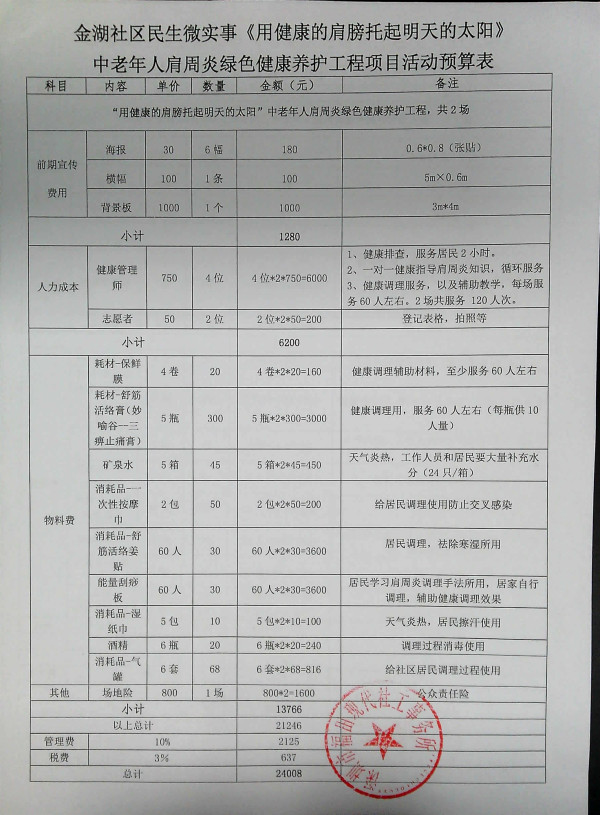 金湖社区民生微实事中老年人肩周炎绿色健康养护工程项目活动预算表公示