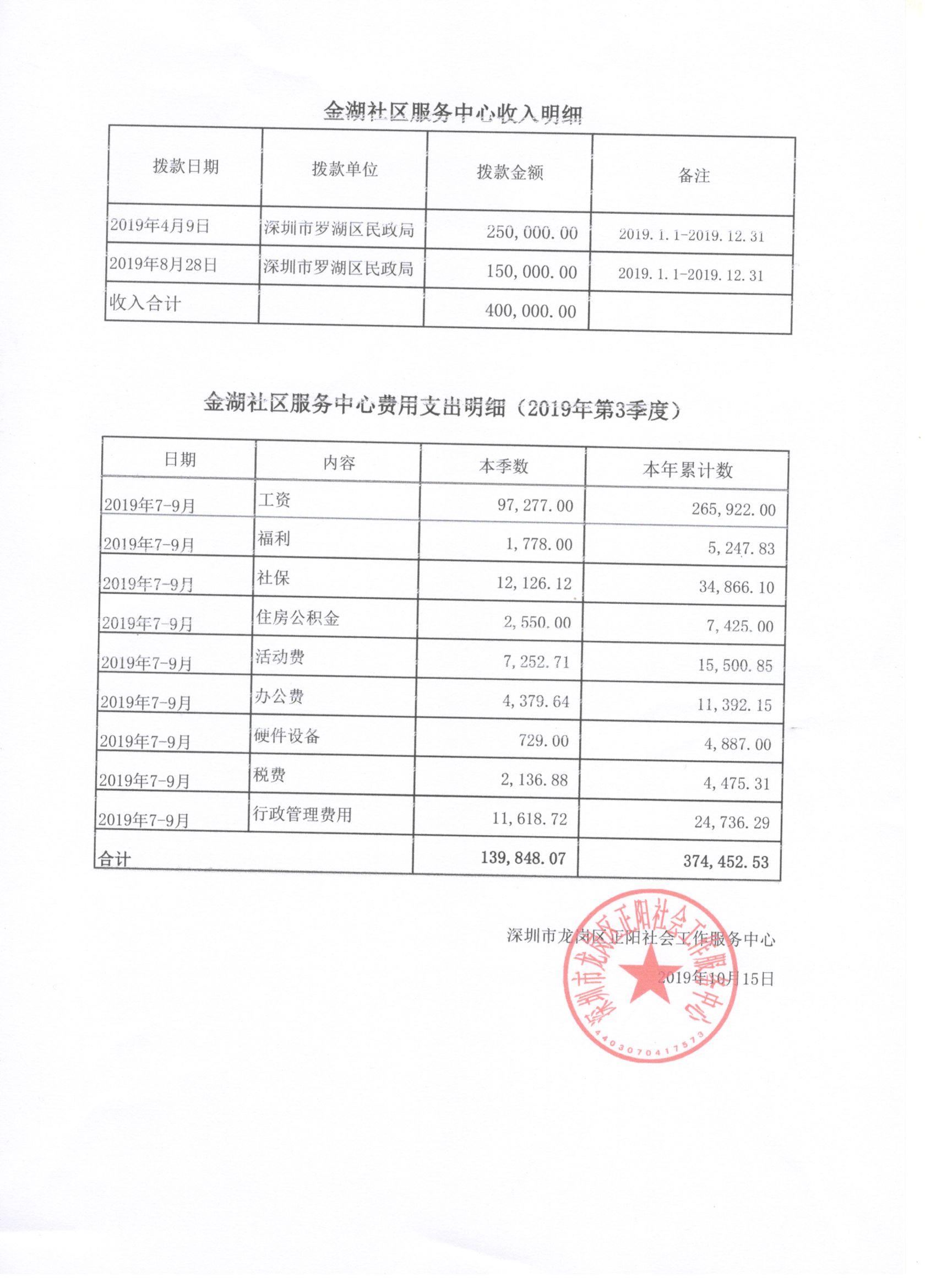 金湖社区党群服务中心2019年第三季度财务公示明细