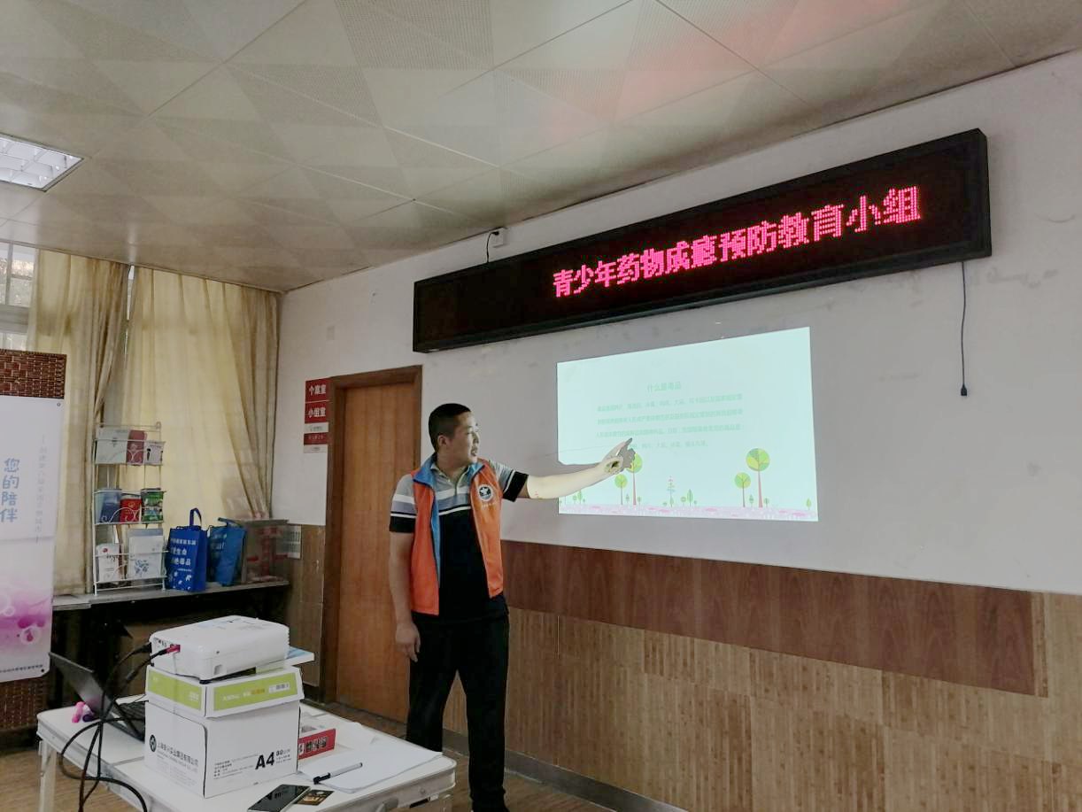 此次课程为小组成员布置了一个开放舒适的空间,小组第一节开始前首先和参与组员讲解了5节小组的流程和内容,接着进行了破冰游戏“快乐绕着地球转”,同时与小组成员讨论“学习效果最大化最小化”来制定小组规则。随后播放了视频“男孩喝止咳水成瘾身高萎缩10厘米”,引导孩子们共同探讨问题“他们因为什么药物成瘾”“止咳水有哪些成分会导致钙流失”“药物成瘾的危害有什么”,并邀请温馨机构的禁毒社工讲解关于“药品和毒品的双重属性”,初步向组员传达什么是用药物成瘾,讲解药品安全知识。