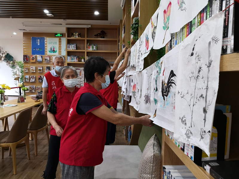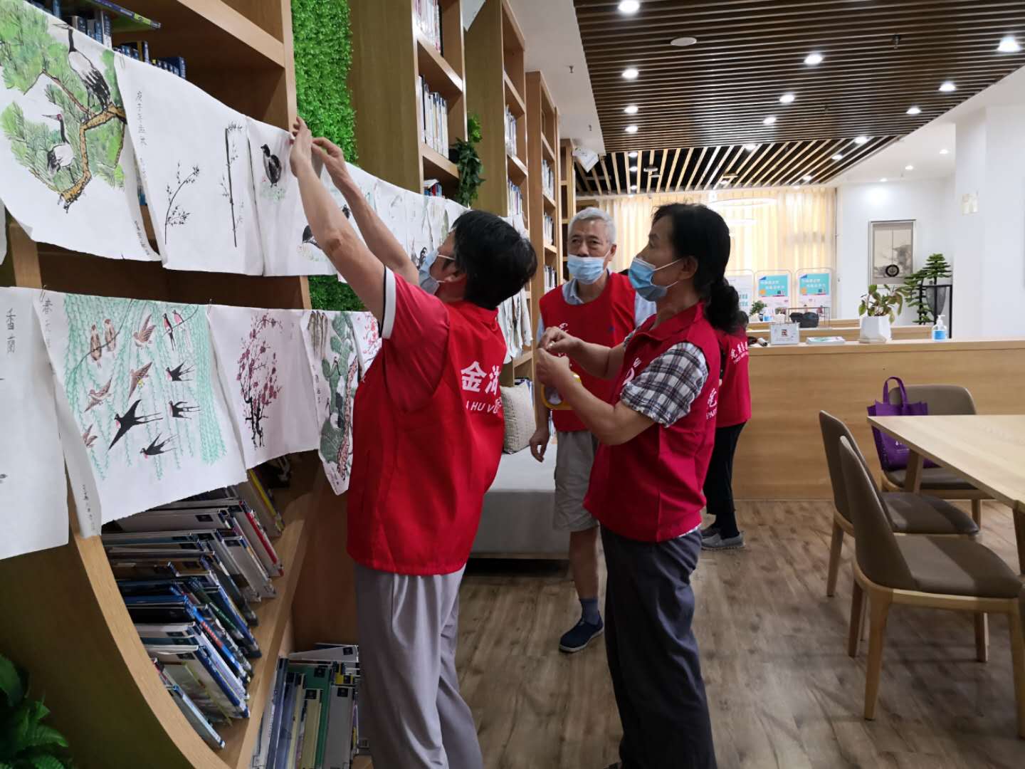 金湖社区淘金山长者书画班迎来了结业的日子。8月27日,金湖社区老协会员志愿者参与社区志愿服务,在淘金山图书馆布置书画班结业会场。