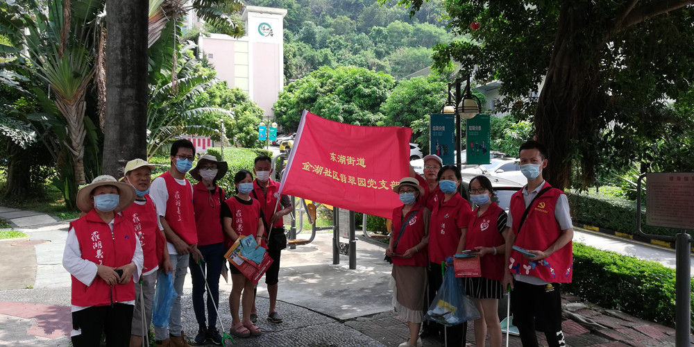 8月29日上午,金湖社区翡翠园小区党支部十余名党员在支部书记带下,冒着艳阳,在翡翠园、绿映居小区捡拾垃圾,派发创文宣传资料,用实际行动支持社区创文工作。