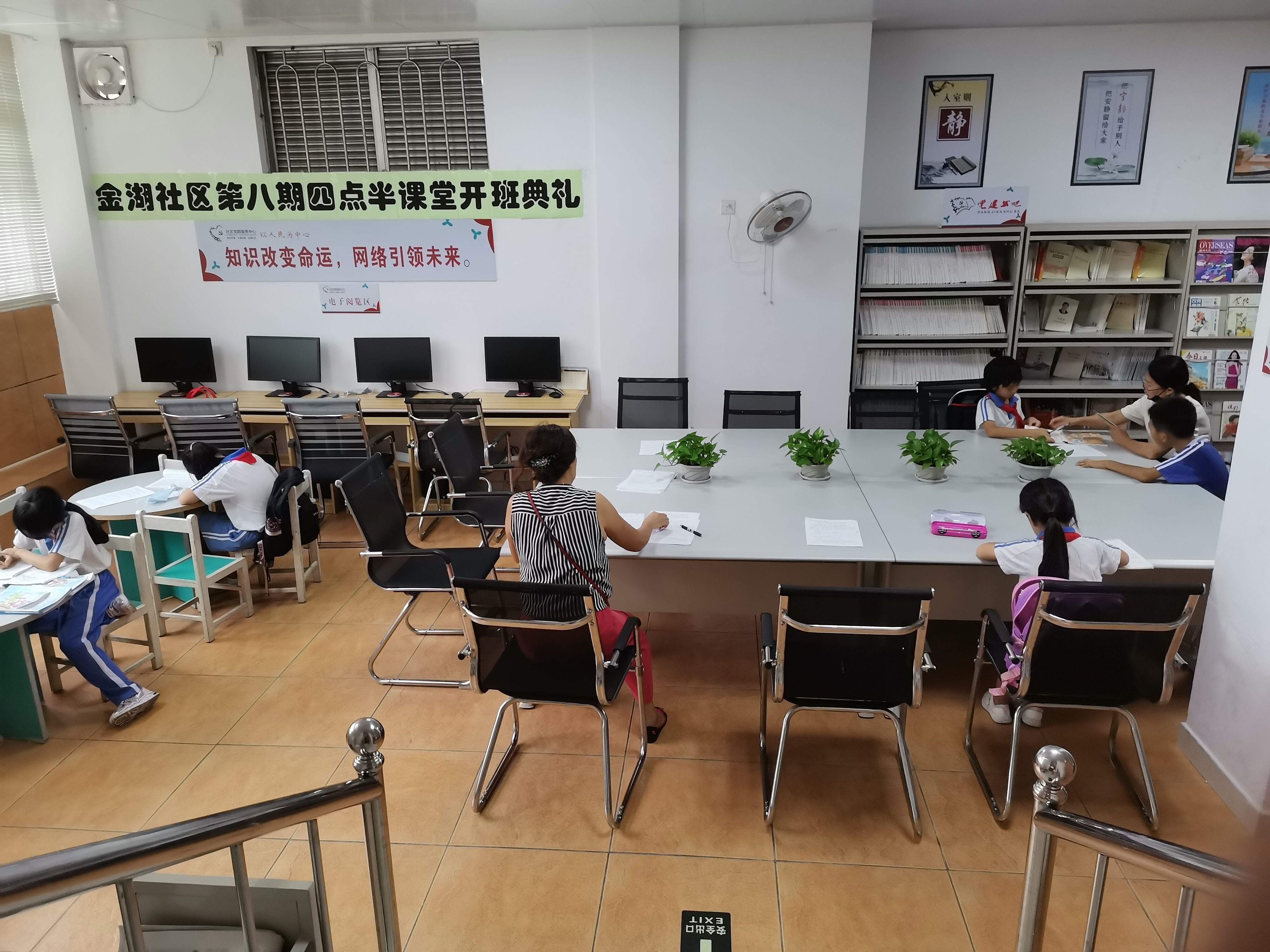 2020年9月4日下午,金湖社区党群服务中心在翡翠园图书室开展了四点半课堂开班典礼,数名社区的孩子和家长参加了四点半课堂。