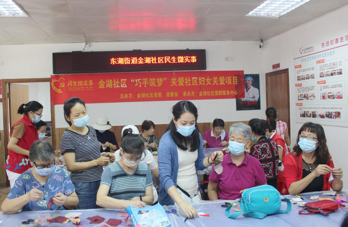 2020年10月17日,金湖社区党群服务中心在绿映居活动室开展了“巧手筑梦”妇女压力疏解之家庭成员情绪香包手工技能学习,共有20名社区妇女参加了此次活动。