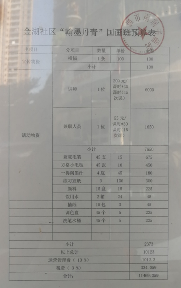 金湖社区“翰墨丹青”国画班预算表