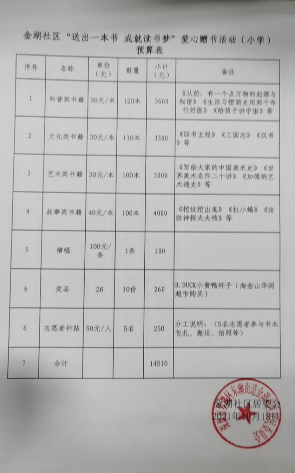 金湖社区“送出一本书 成就读书梦”爱心赠书活动(小学)预算表