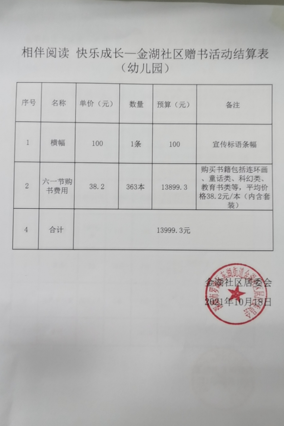 相伴阅读 快乐成长——金湖社区赠书活动结算表(幼儿园)