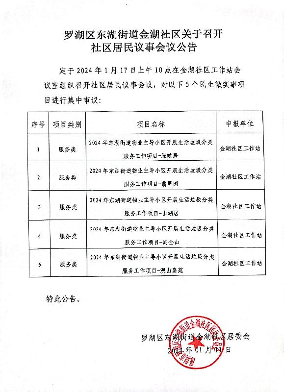 东湖街道金湖社区关于召开社区居民议事会议公告