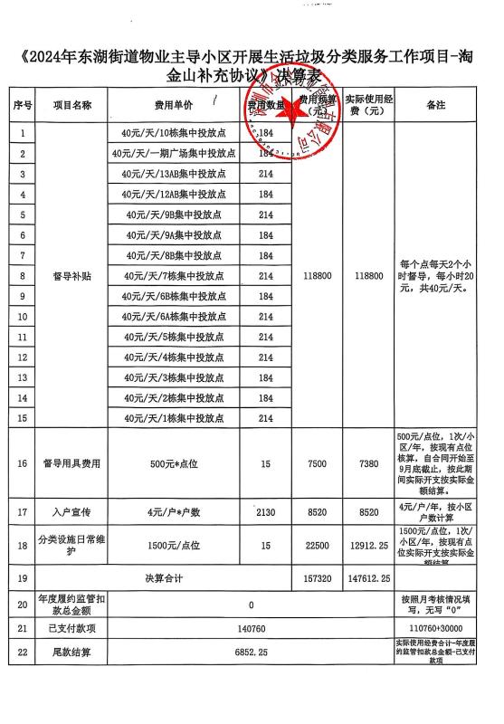 《2024年东湖街道物业主导小区开展生活垃圾分类服务工作项目-淘金山补充协议》决算表