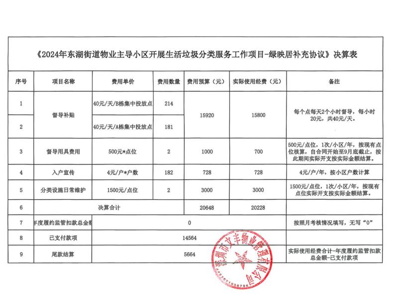 《2024年东湖街道物业主导小区开展生活垃圾分类服务工作项目-绿映居补充协议》决算表