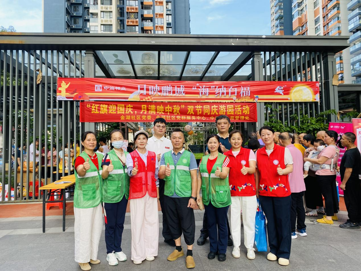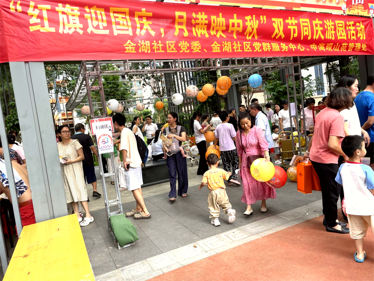 罗湖家园网讯:金风送爽桂飘香,双节同庆情意长。为弘扬中华优秀传统文化,营造浓厚节日氛围,搭建邻里互动平台,9月28日下午,在金湖社区党委的领导下,金湖社区党群服务中心以“红旗迎国庆,月满映中秋”为主题,精心策划了一场集趣味、温情、文化于一体的双节同庆游园活动。活动吸引了上百名社区居民参与,现场灯笼高挂,既是对“月圆人圆”的中秋礼赞,更是对“国泰民安”的国庆献礼,绘就了一幅“党建引领、邻里共融”的温馨画卷。