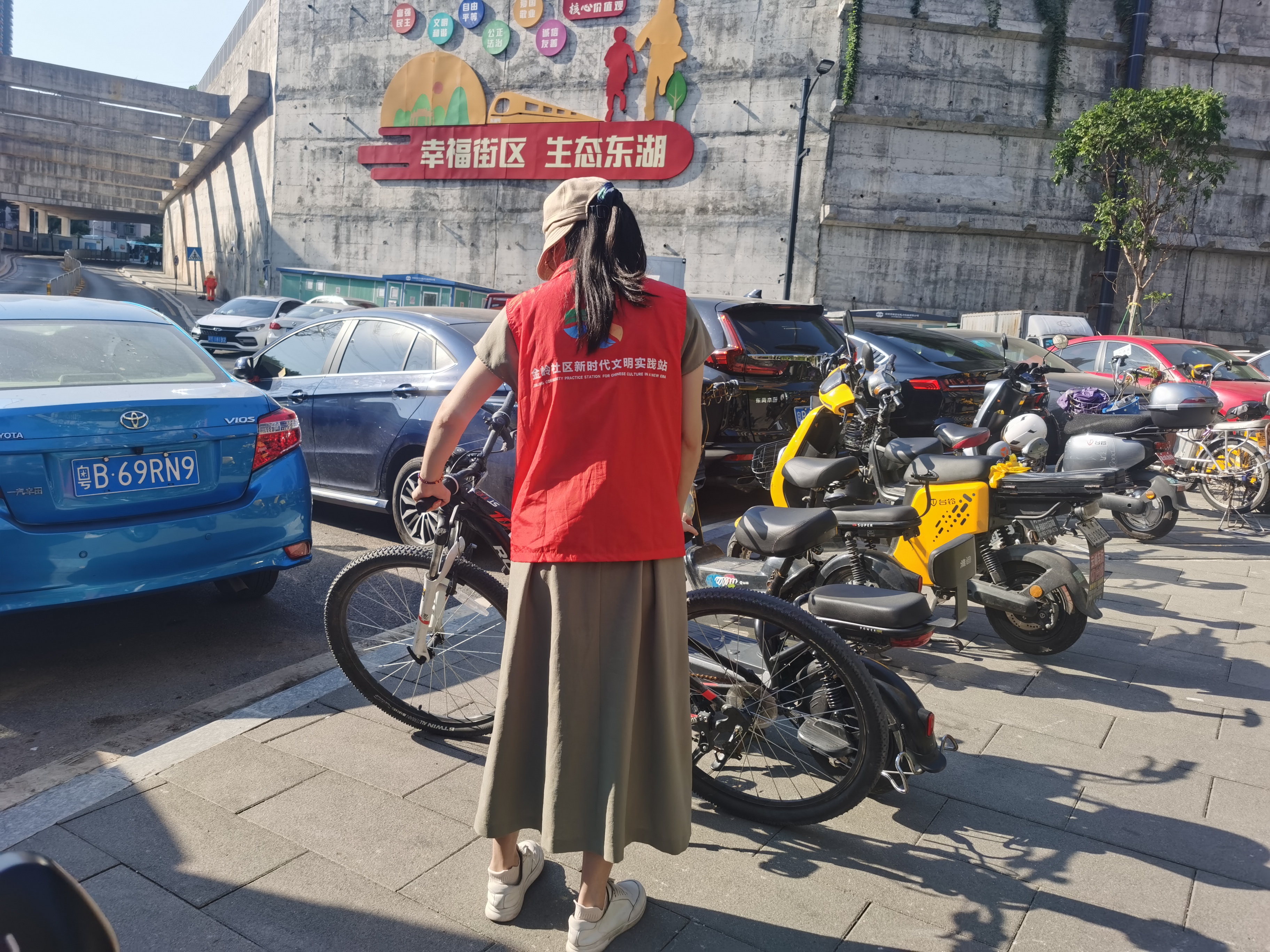 10月15日,金岭社区党委副书记吴秋玲带队,对违规停放的电动单车进行规范停放,助力文明城市创建。