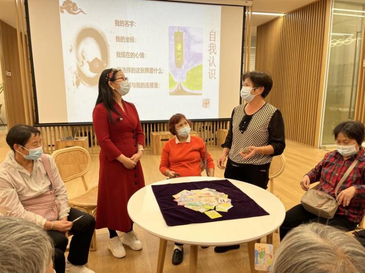OH卡牌又被称为“潜意识图像卡”,OH卡是基于精神分析心理咨询相关理论,通过看图讲主题故事,帮助来访者探索潜意识,分析心理动力结构,寻找问题解决之道,实现心灵疗愈。活动中,杜老师将活动分为自我介绍、故事接龙、黄金时刻三个环节。首先为长者们详细介绍了OH卡牌的起源,然后让大家选择对应的卡牌图片。接着询问长者们看到图片的感受,通过图片联想到自己生活中的哪些事件,以“我”开头说一段话或编一个故事,把画面内容和文字串在里面。在老师们的耐心引导下,大家打开内心世界,全情参与其中,探寻潜意识与现实生活之间的种种联系。在分享过程中,老师时刻叮嘱大家尊重他人的发言,表达感受不分对错,先聆听别人发表再分享自己的观点。在互相交流中,长者们明白了每个人对卡牌都有不一样理解,不同的角度看到的也不一样,学会接纳自己同时也学会理解接纳他人,现场气氛轻松愉快,大家一致认为要关注自己的身心健康,开心快乐地生活就是对子女最大的支持。一场心的旅程就在探索内在中结束了。