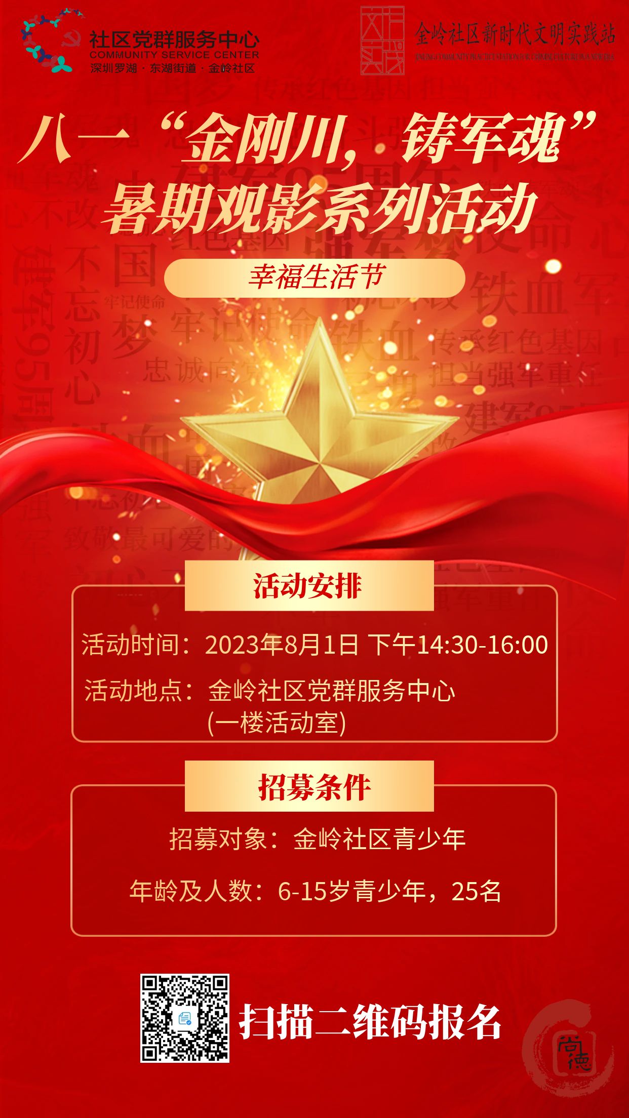 2.活动内容:八一建军节来临之际,一起相约金岭社区重温电影《金刚川》,铭记历史,向中国军人致敬。