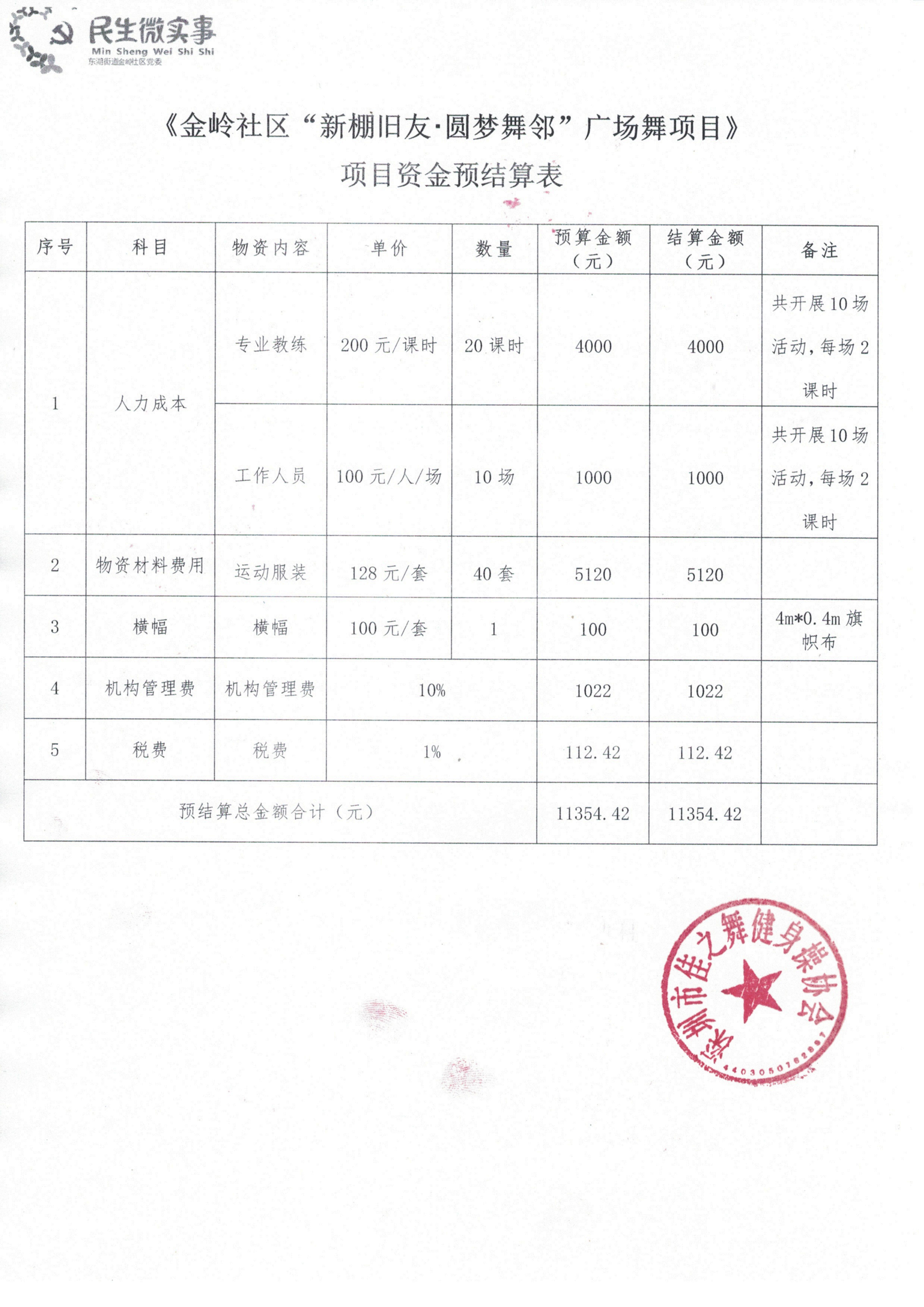 罗湖区家园网讯:2023年民生微实事《金岭社区“新棚旧友·圆梦舞邻”广场舞项目》项目资金预结算表公示