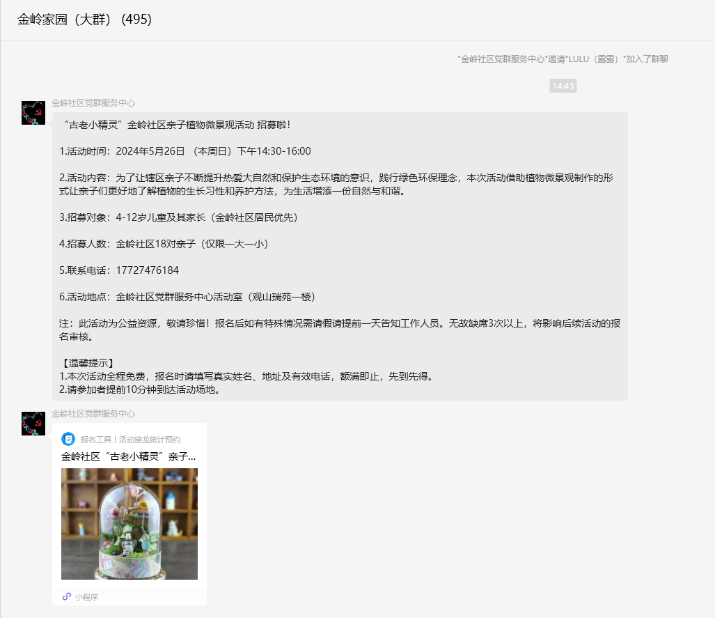 2.活动内容:为了让辖区亲子不断提升热爱大自然和保护生态环境的意识,践行绿色环保理念,本次活动借助植物微景观制作的形式让亲子们更好地了解植物的生长习性和养护方法,为生活增添一份自然与和谐。