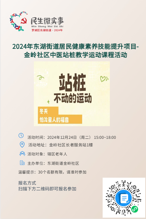 罗湖区家园网讯:【民生微实事】【2024年东湖街道居民健康素养技能提升项目--金岭社区中医站桩教学运动课程活动招募】