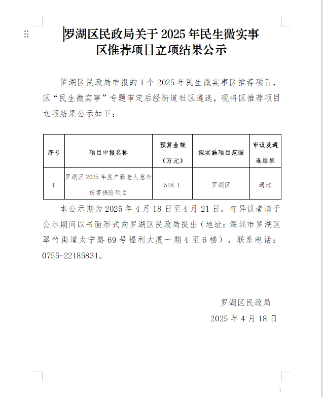 罗湖区家园网讯:罗湖区民政局关于2025年民生微实事区推荐项目立项结果公示