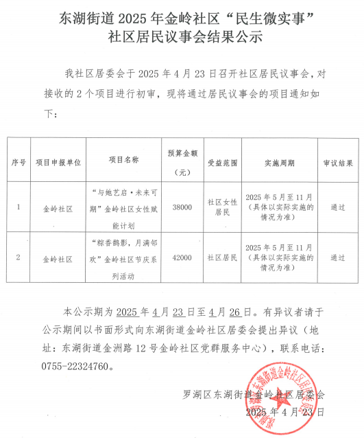 罗湖区家园网讯:东湖街道2025年金岭社区“民生微实事”社区居民议事会结果公示