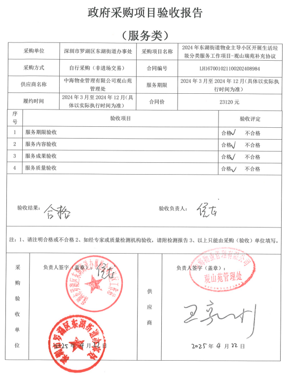 罗湖区家园网讯:民生微实事《2024年东湖街道物业主导小区开展生活垃圾分类服务工作项目-观山瑞苑补充协议》项目验收报告