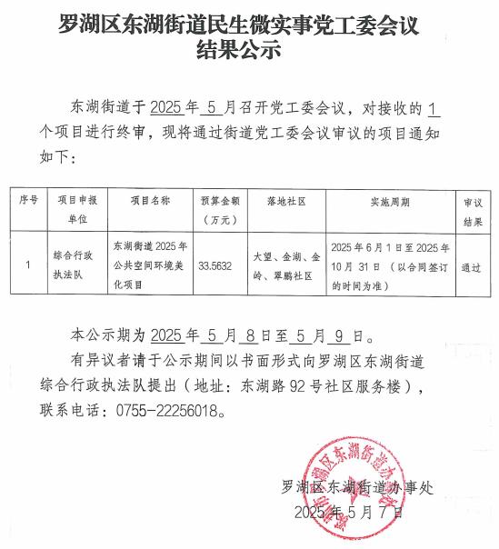 罗湖区家园网讯:罗湖区东湖街道民生微实事党工委会议结果公示