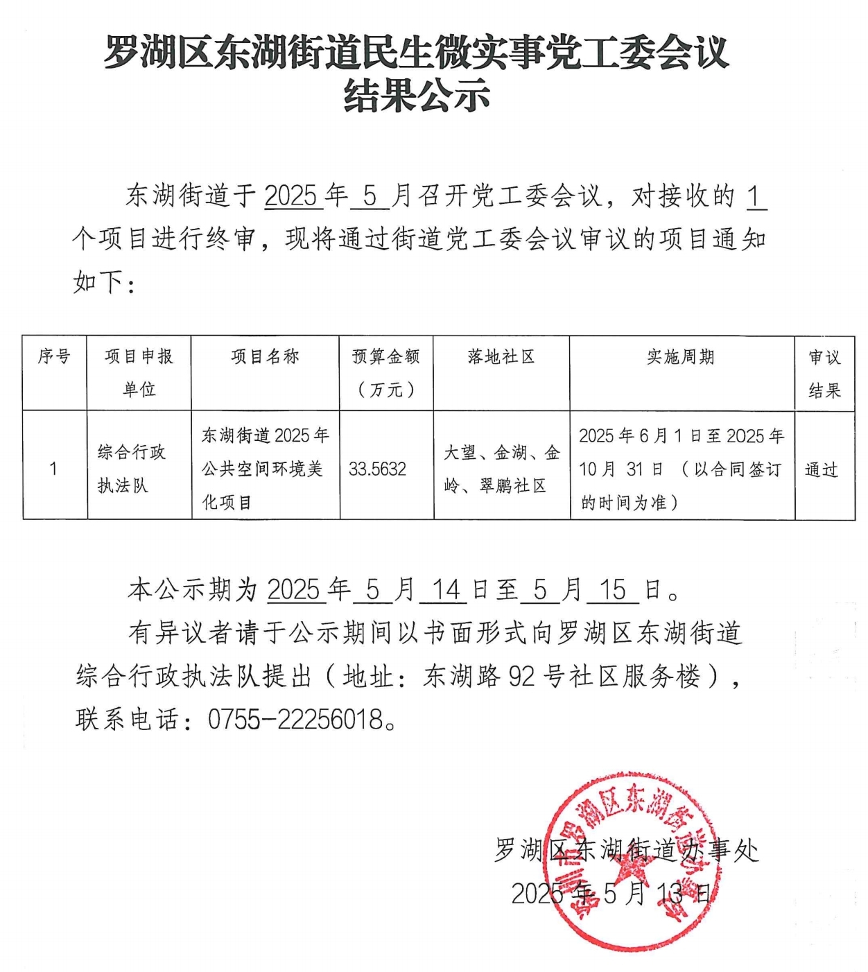 罗湖区家园网讯:罗湖区东湖街道民生微实事党工委会议结果公示