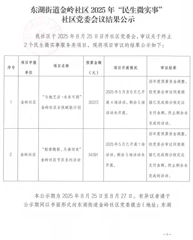 罗湖区家园网讯:东湖街道金岭社区2025年“民生微实事”社区党委会议结果公示