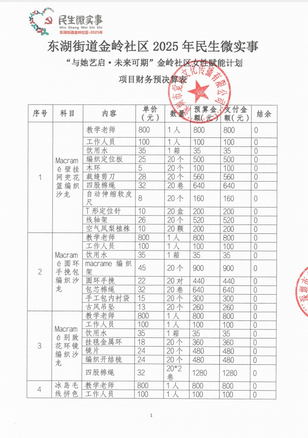 【民生微实事】“与她艺启·未来可期”金岭社区女性赋能计划项目财务决算表