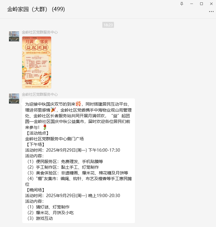 罗湖家园网讯:为迎接中秋国庆双节的到来,同时搭建居民互动平台、增进邻里感情,金岭社区党委携手中海物业观山苑管理处、金岭社区长者服务站共同开展月满邻欢,“益”起团圆—金岭社区国庆中秋公益集市,届时欢迎各位居民们前来参与!