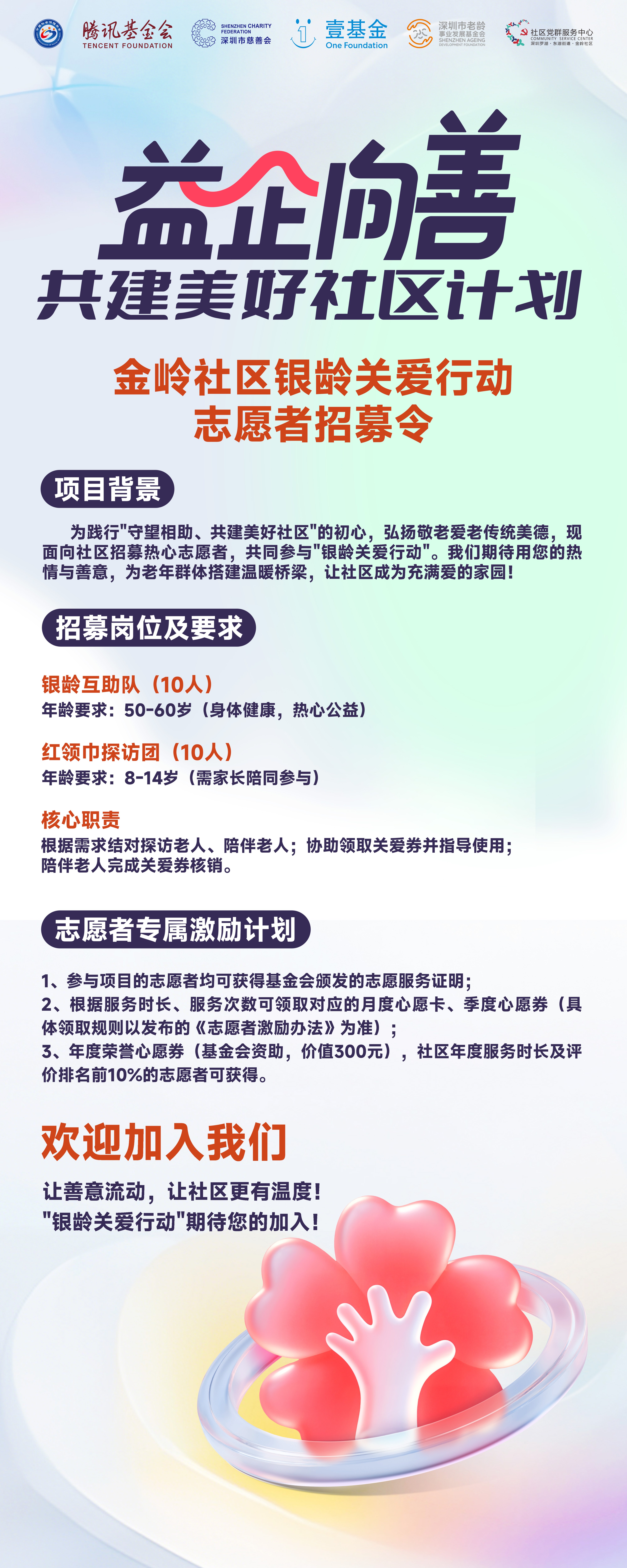 【项目背景】为践行"守望相助、共建美好社区"的初心,弘扬敬老爱老传统美德,现面向社区招募热心志愿者,共同参与"银龄关爱行动"。我们期待用您的热情与善意,为者年群体搭建温暖桥梁,让社区成为充满爱的家园。