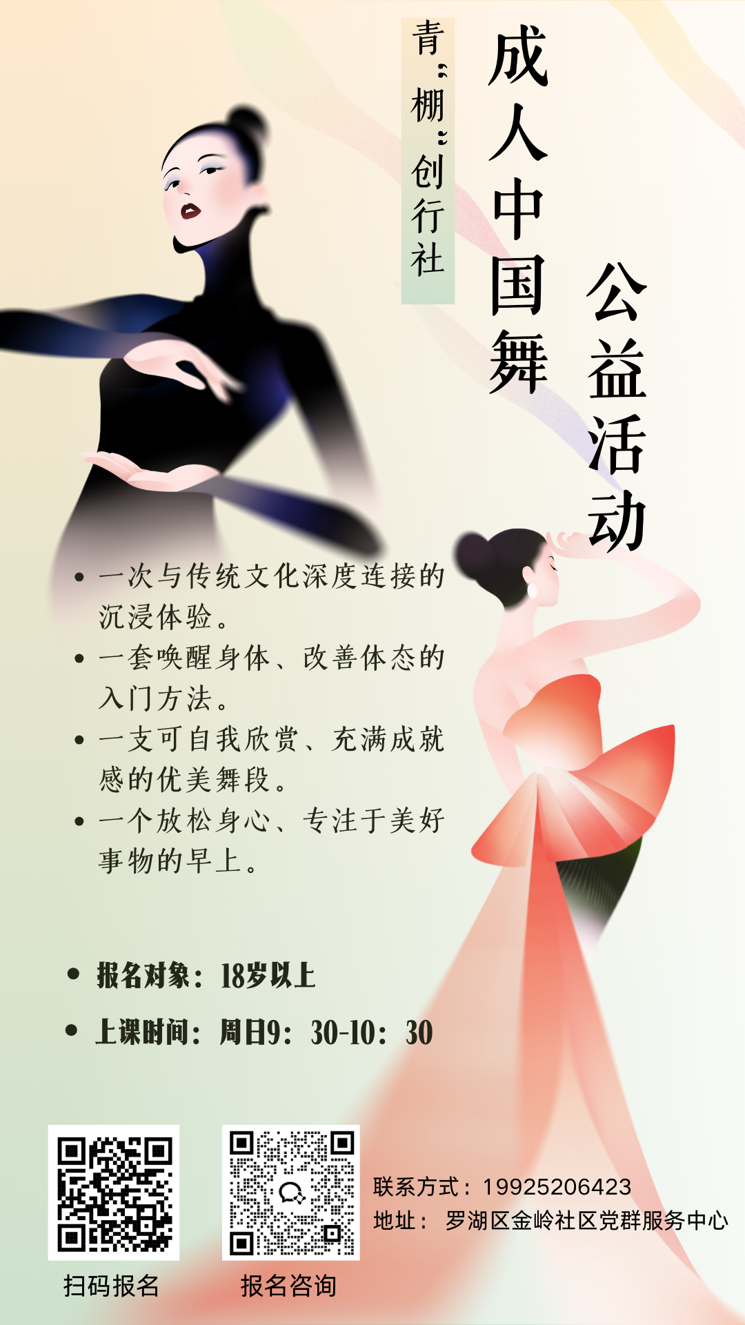 【活动特色】一次与传统文化深度连接的沉浸体验。一套唤醒身体、改善体态的入门方法。一支可自我欣赏感的优美舞段。一个放松身心、专注于美好事物的早上。