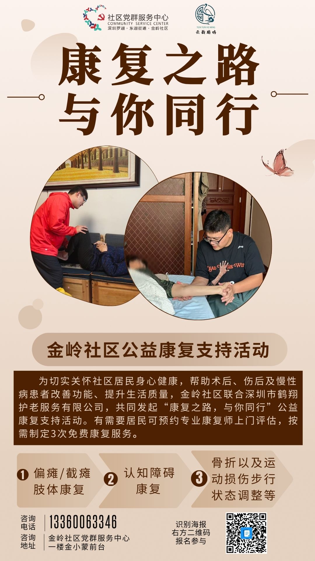 罗湖家园网讯:为切实关怀社区居民身心健康,帮助术后、伤后及慢性病患者改善功能、提升生活质量,金岭社区党群服务中心联合深圳市鹤翔护老服务有限公司,共同发起“康复之路,与你同行”金岭社区公益康复支持活动,有需要的居民朋友可识别海报二维码进行报名。