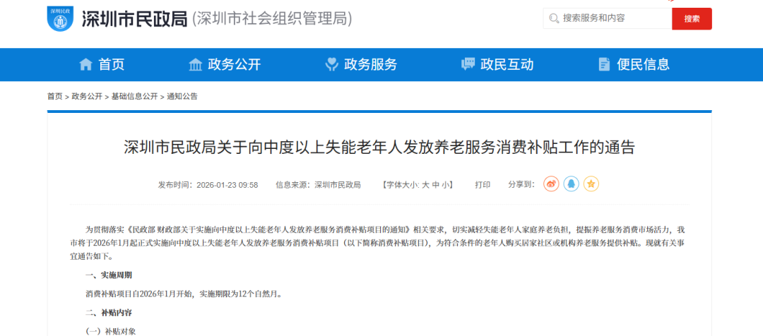罗湖家园网讯:为切实减轻失能老年人家庭养老负担,推动养老服务体系高质量发展,记者从深圳市民政局获悉,深圳2026年1月起正式实施向中度以上失能老年人发放养老服务消费补贴项目,通过电子消费券形式为符合条件的老年人购买居家社区或机构养老服务提供补贴支持,每人每月最高抵扣800元,为期12个自然月。