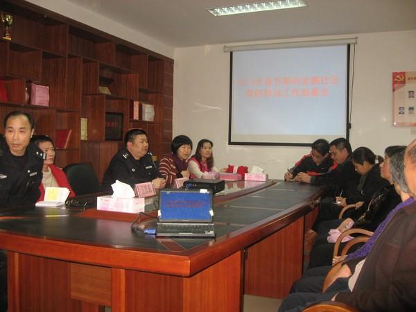 1月17日下午,金鹏社区召开群防群治工作部署会议。东湖派出所张奕元所长、社区民警、社区房管站、港鹏新村管理处、谱心苑管理处、辖区自治议事会及巡逻队员共30人参加了会议。工作站站长刘芳同志首先对辖区单位管理处、自治议事会做好春节期间的群防群治工作做了布置与安排。然后,东湖派出所所长张奕元同志简报了2012年度金鹏辖区治安警情等各项指标都有所下降,对辖区各群防群治队伍一年来所做的工作予以肯定,同时对春节期间治安情况提出要求,要求大家要切实提高警惕、群防群控,切实把工作做细、做实,共同维护社区治安和谐稳定。